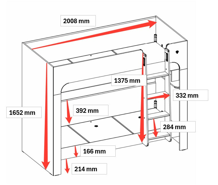 Each sleeping area has a maximum load capacity of 130 kg, and the internal mattress size is 90x200 cm, ensuring the bed is durable for many years of use.