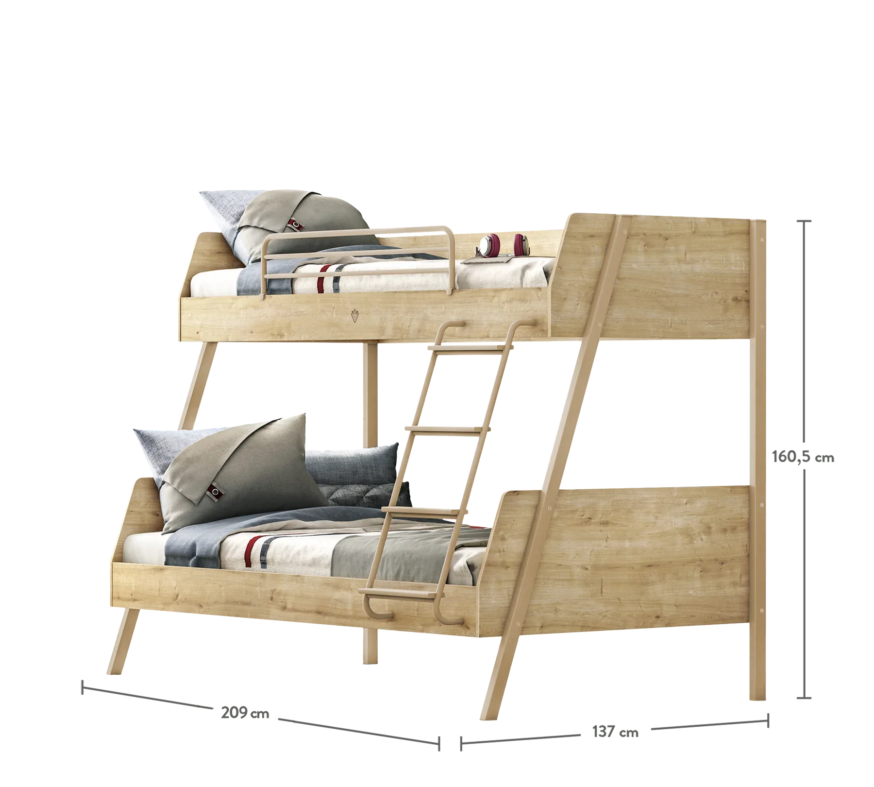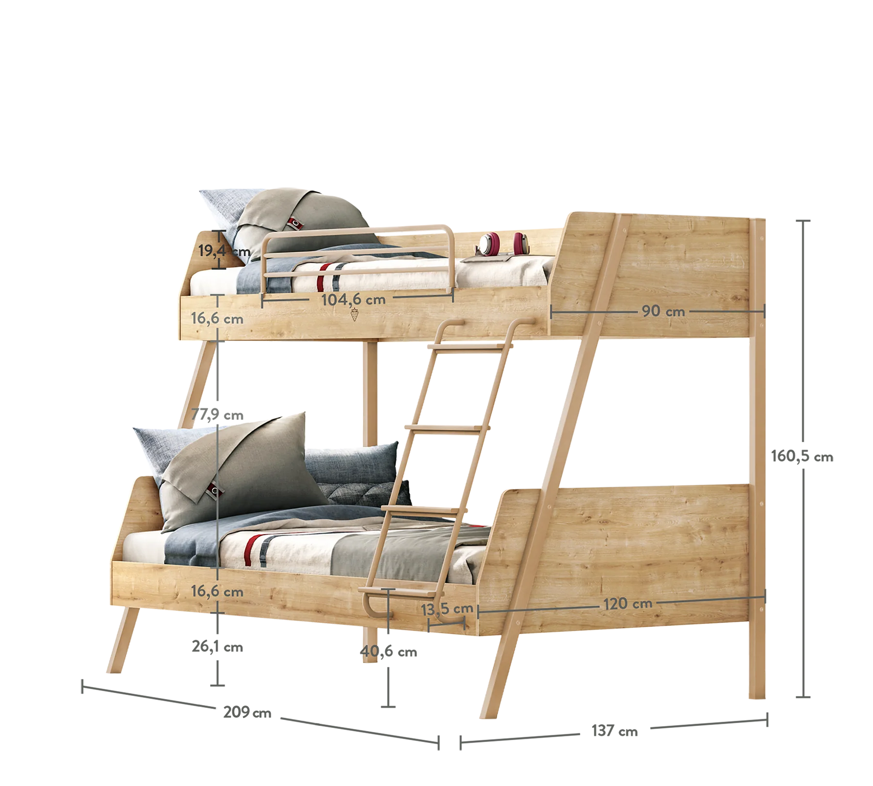 Each sleeping area has a maximum weight capacity of 130 kg, while the inner bed dimensions are 90x200 cm for the top and 120x200 cm for the bottom in Bunk Beds, which can be used for many years with its sturdy structure. Note: Wide bunk beds do not have a separation feature.