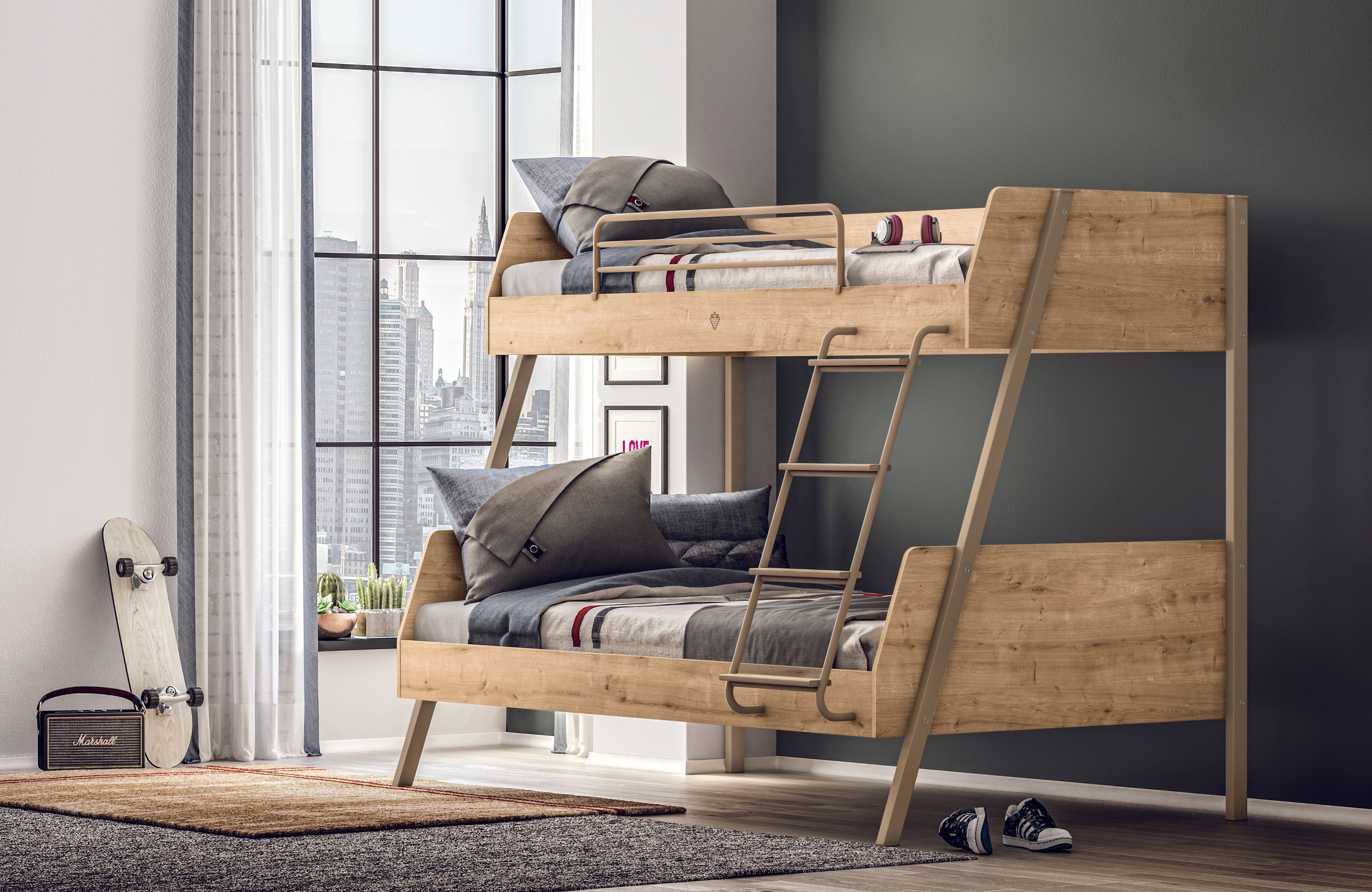 Brings a different interpretation to young rooms with its dynamic lines that prioritize naturalness. The ladder, which can be mounted on the right or left side, provides ease of use, while the lower bed with dimensions of 120x200 offers a wide and spacious sleeping area. Note: Wide bunk beds do not have a separation feature.